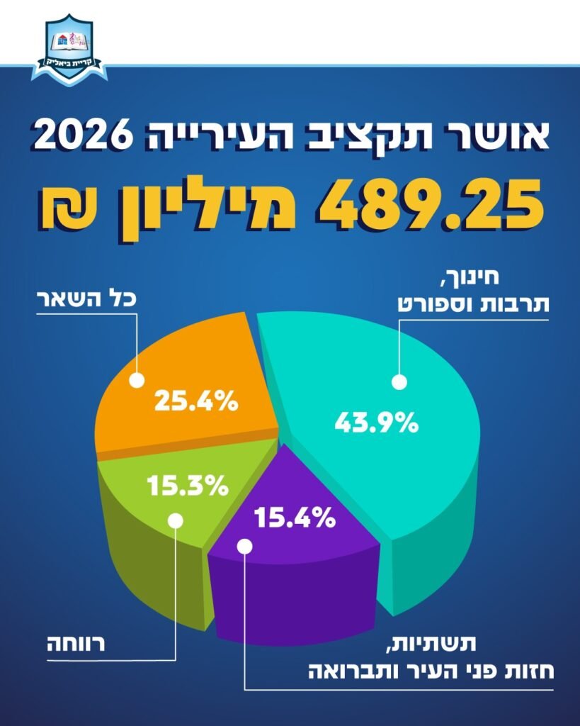 מועצת העיר קריית ביאליק אישרה אמש (31.12.25) את תקציב העירייה לשנת 2026 בהיקף של כ־489 מיליון שקלים. מדובר בתקציב מאוזן, שנבנה ל־12 חודשי פעילות וממשיך את קו הניהול האחראי של העירייה גם בתקופה של אי־ודאות כלכלית וביטחונית. עיקר התקציב מופנה ישירות לשירותים לתושב. כ־43.9% מהתקציב יושקעו בחינוך, תרבות וספורט, לרבות מערכת החינוך על כל שלביה, […]